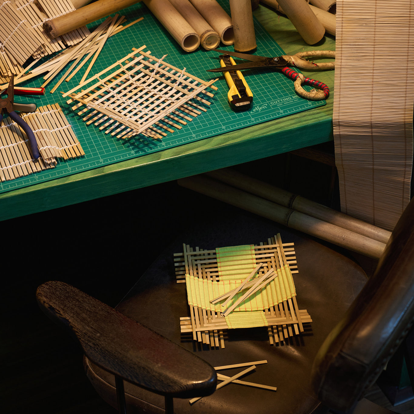 Weaving by assembly, hand-finished stitching